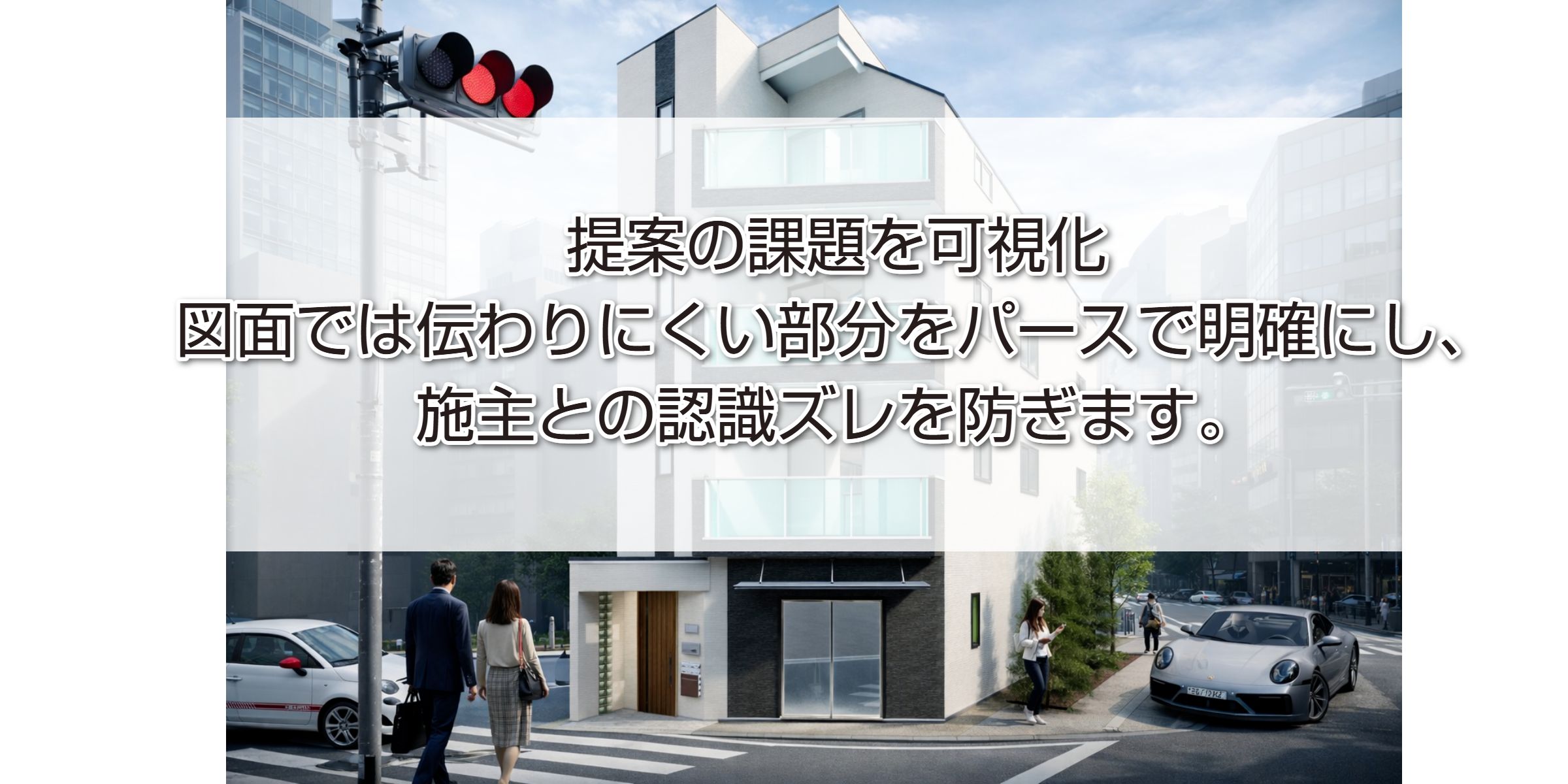 時間・費用・修正負担を抑えながら、提案に使えるパースをスピーディーに作成します。