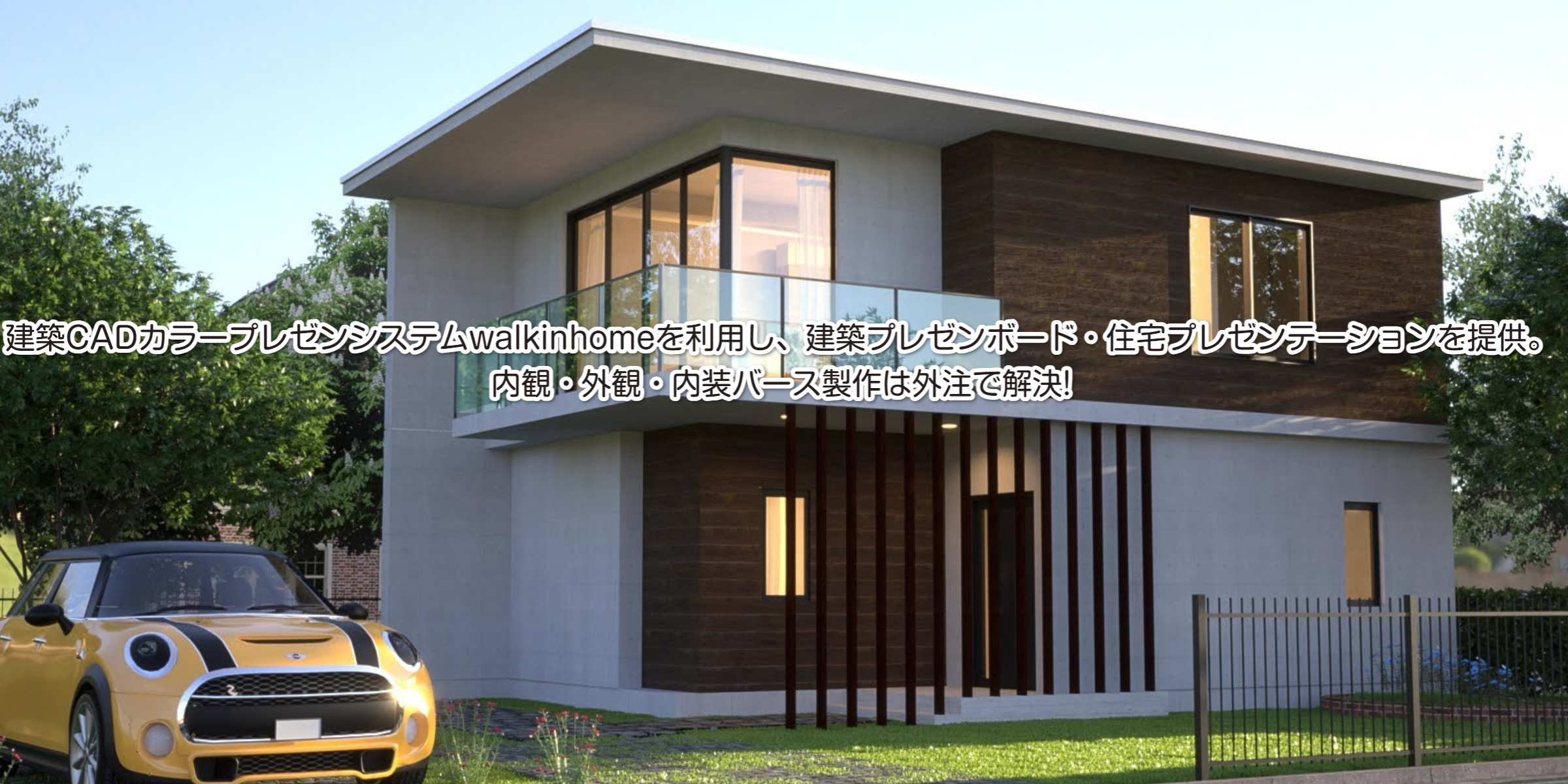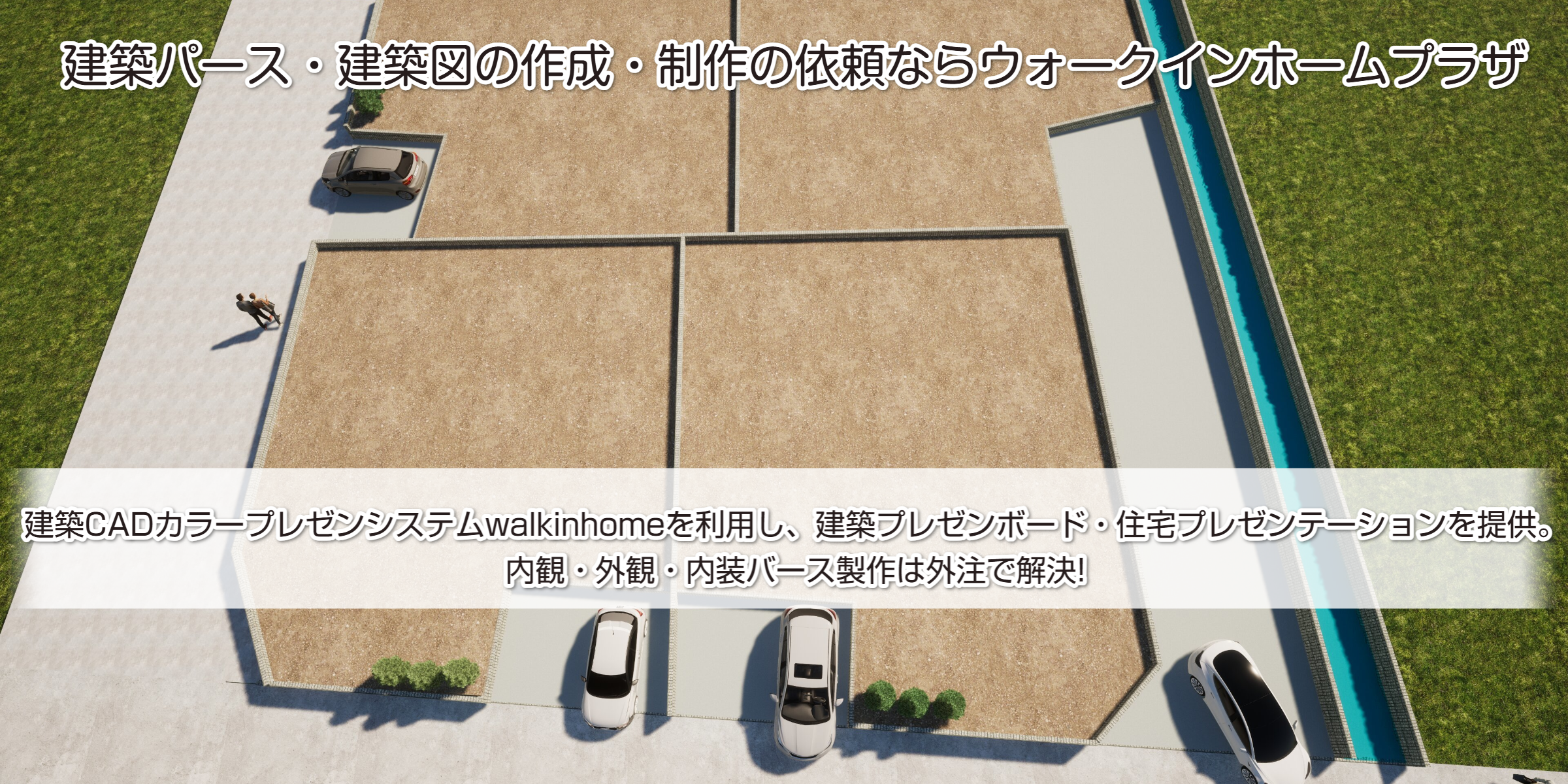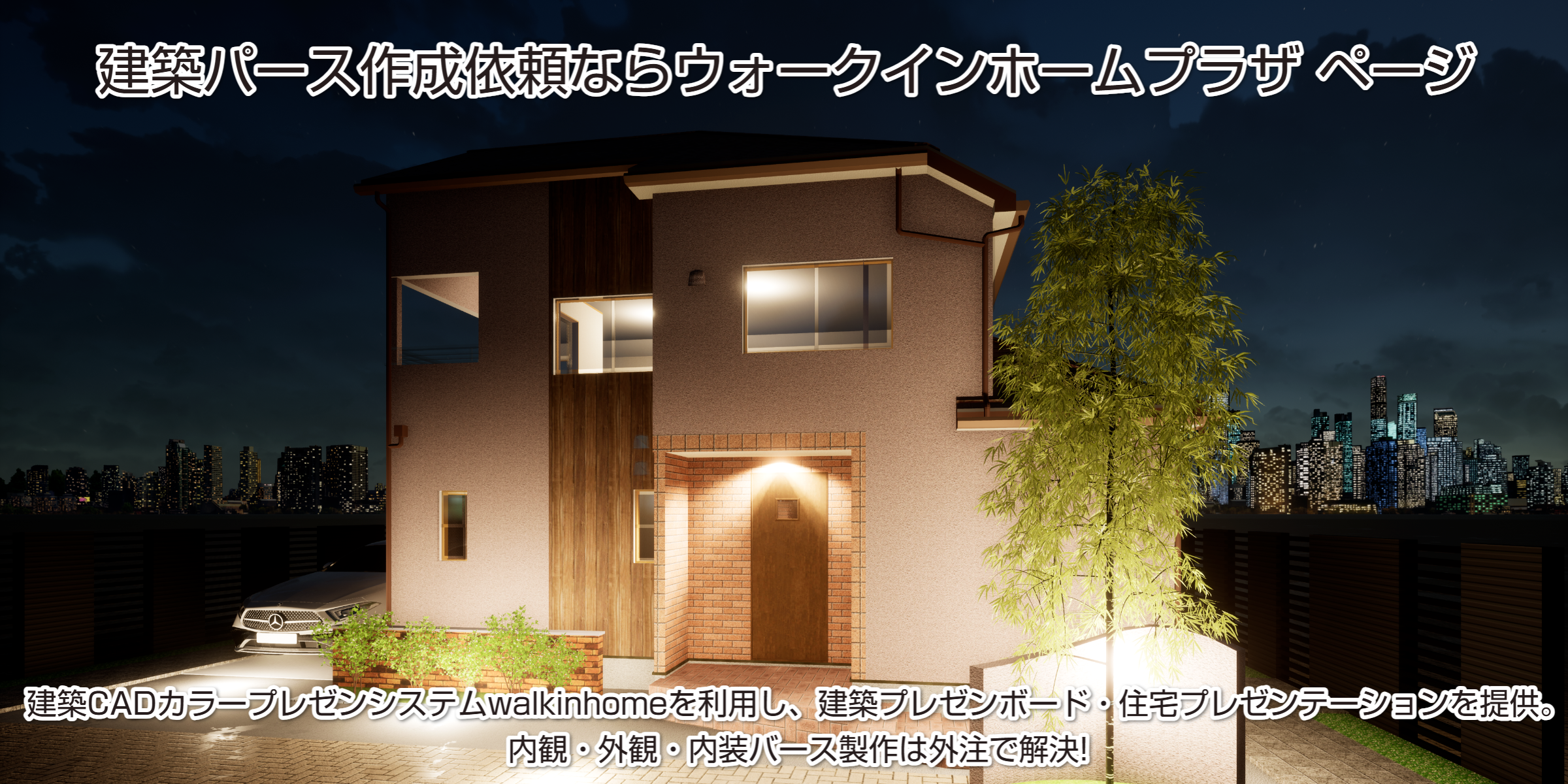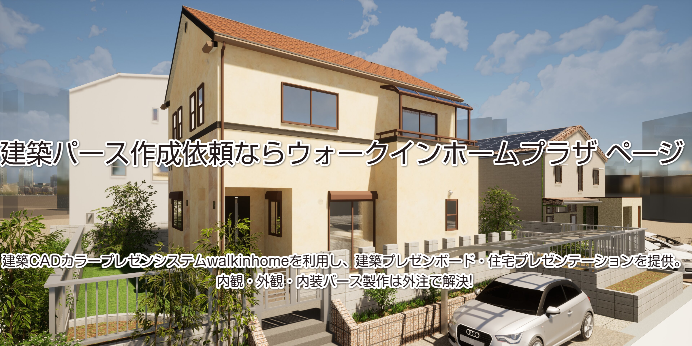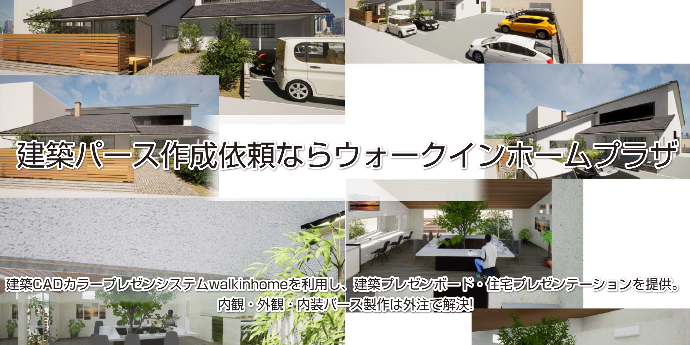 建築パース作成・建築パースの作制・制作の依頼ならウォークインホームプラザ。建築CADカラープレゼンシステム walkinhomeを利用し、建築プレゼンボード・住宅プレゼンテーションを提供。内観・外観・内装バース製作は外注で解決!