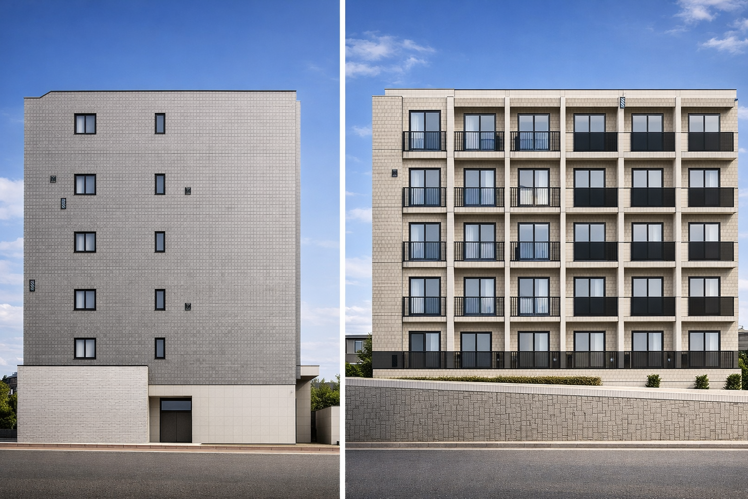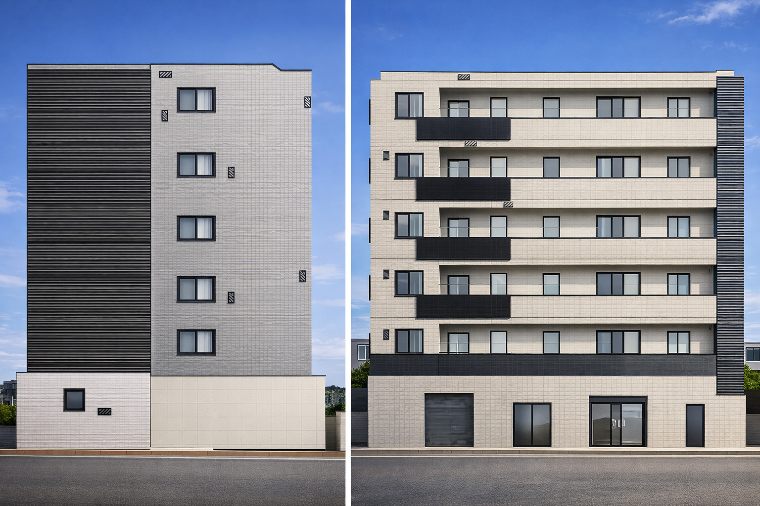 写真リアル仕上げ|タイル貼りマンション立面パース