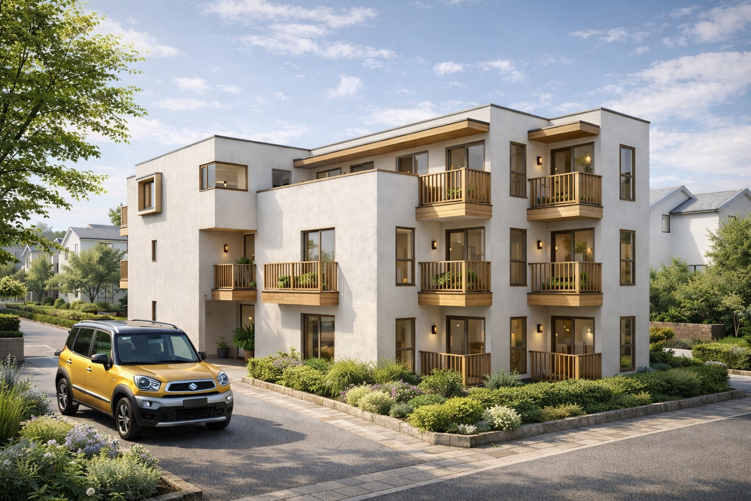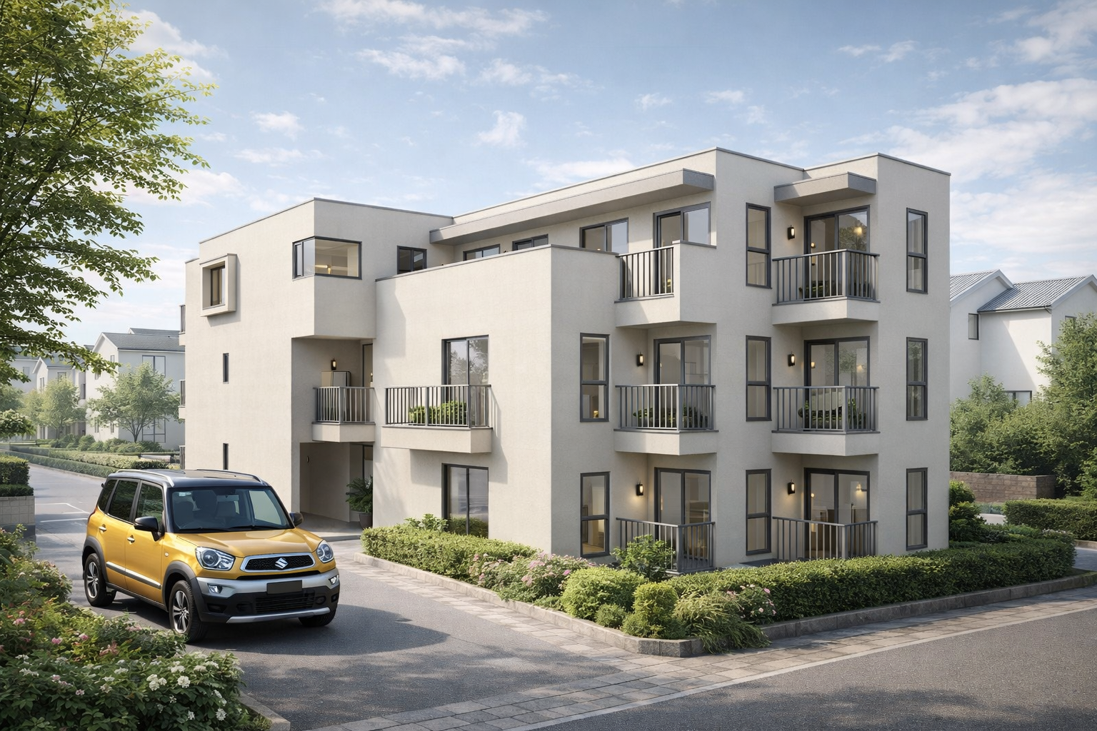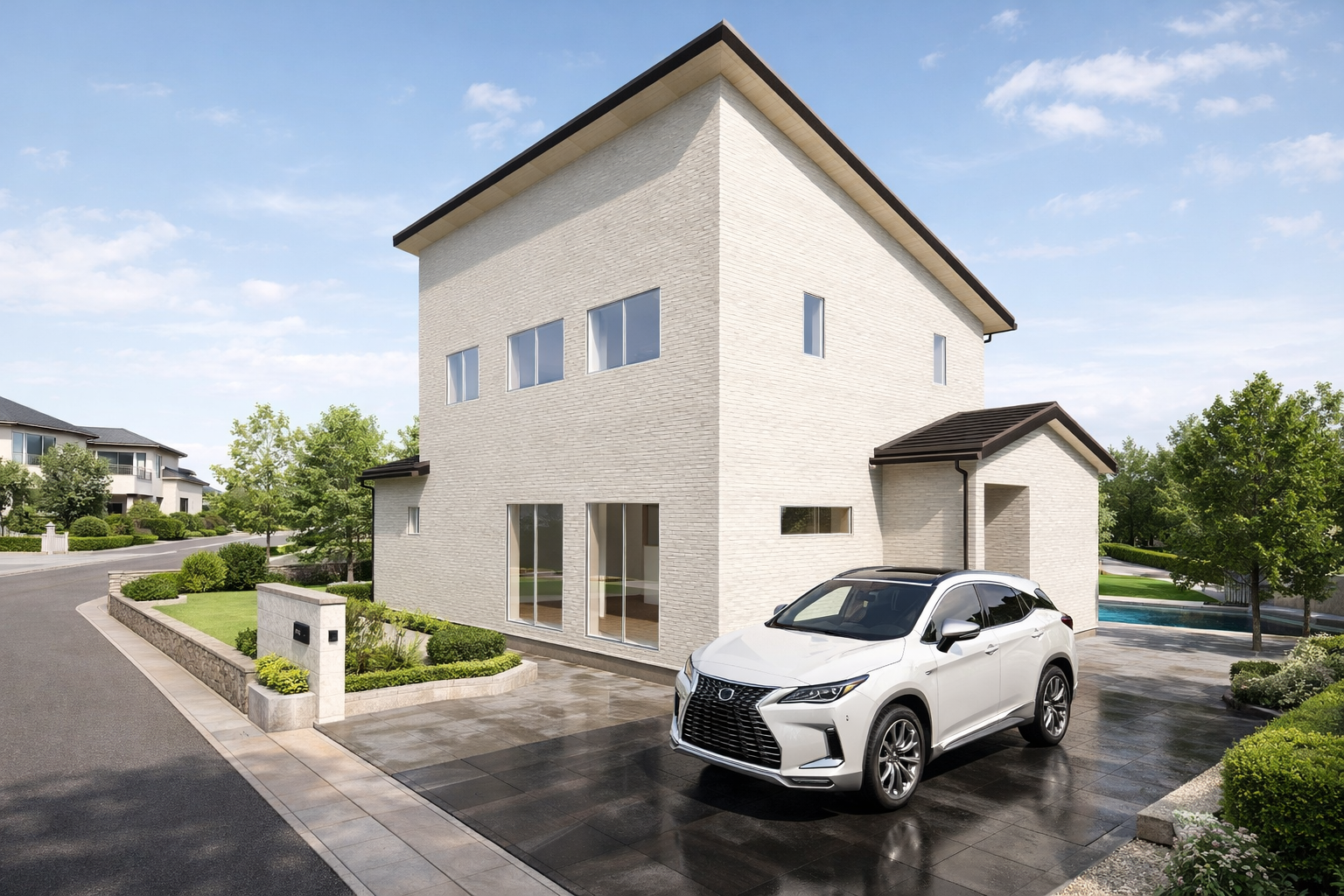 周辺の住宅街になじむ落ち着きのあるデザインに、高級車や植栽計画を加えることで、建物単体ではなく暮らし全体の質感まで伝わる提案パースとなっています。