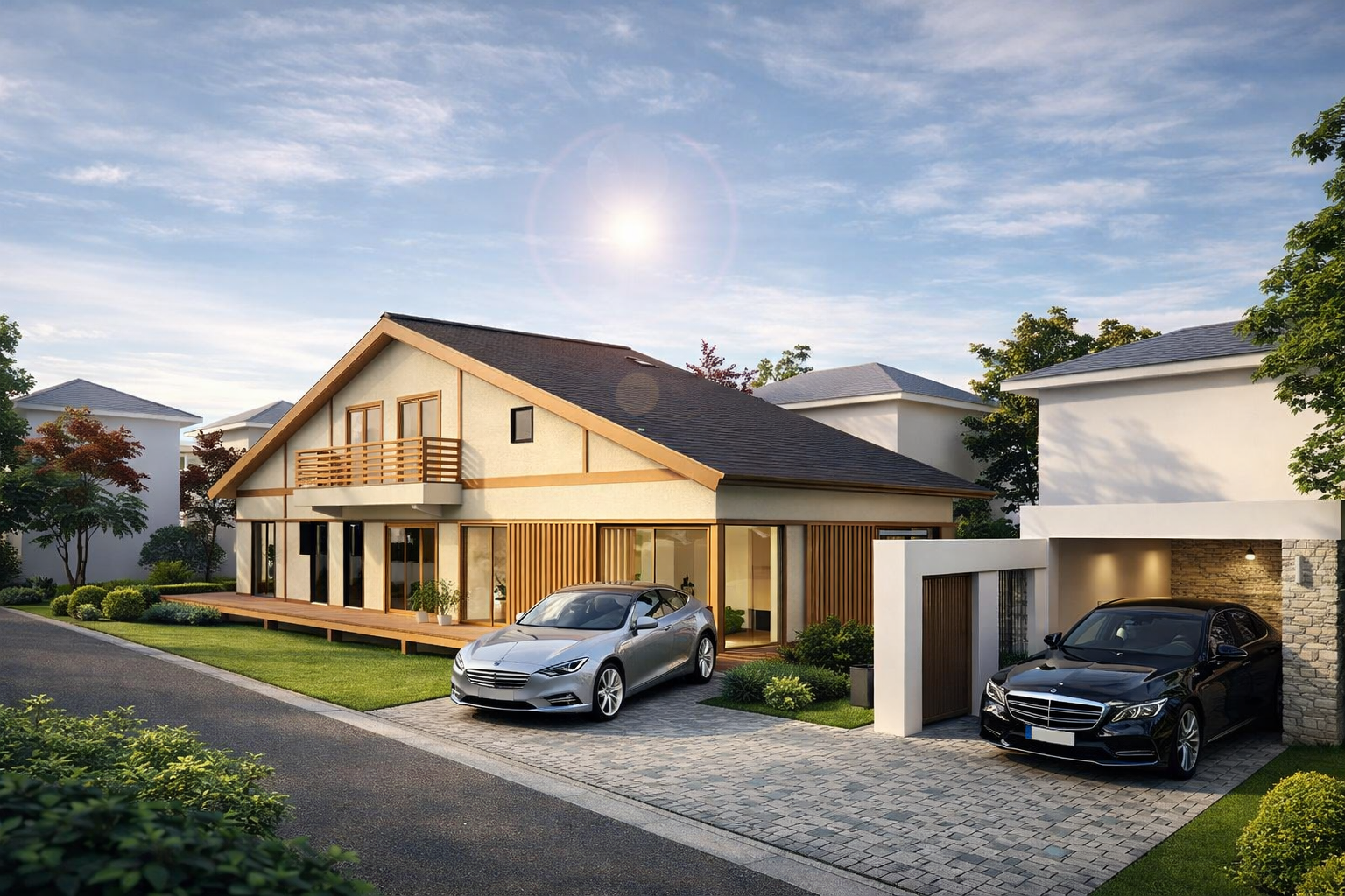 • 白系×木目アクセントの外壁で、温かみと高級感を両立