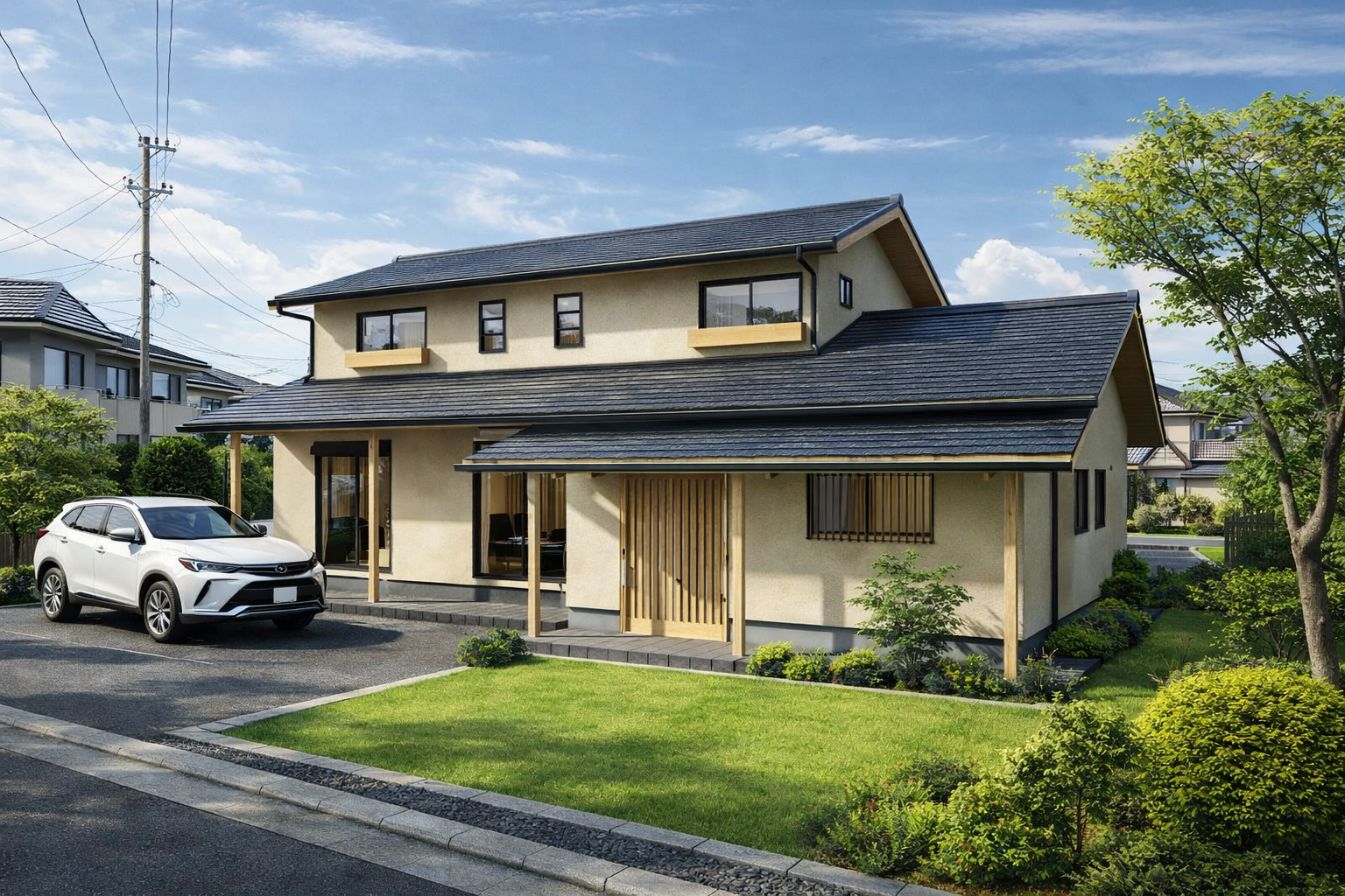 明るい外壁に木目の縦格子や軒まわりのアクセントを加えることで、ナチュラルでありながら洗練された印象に仕上げています。