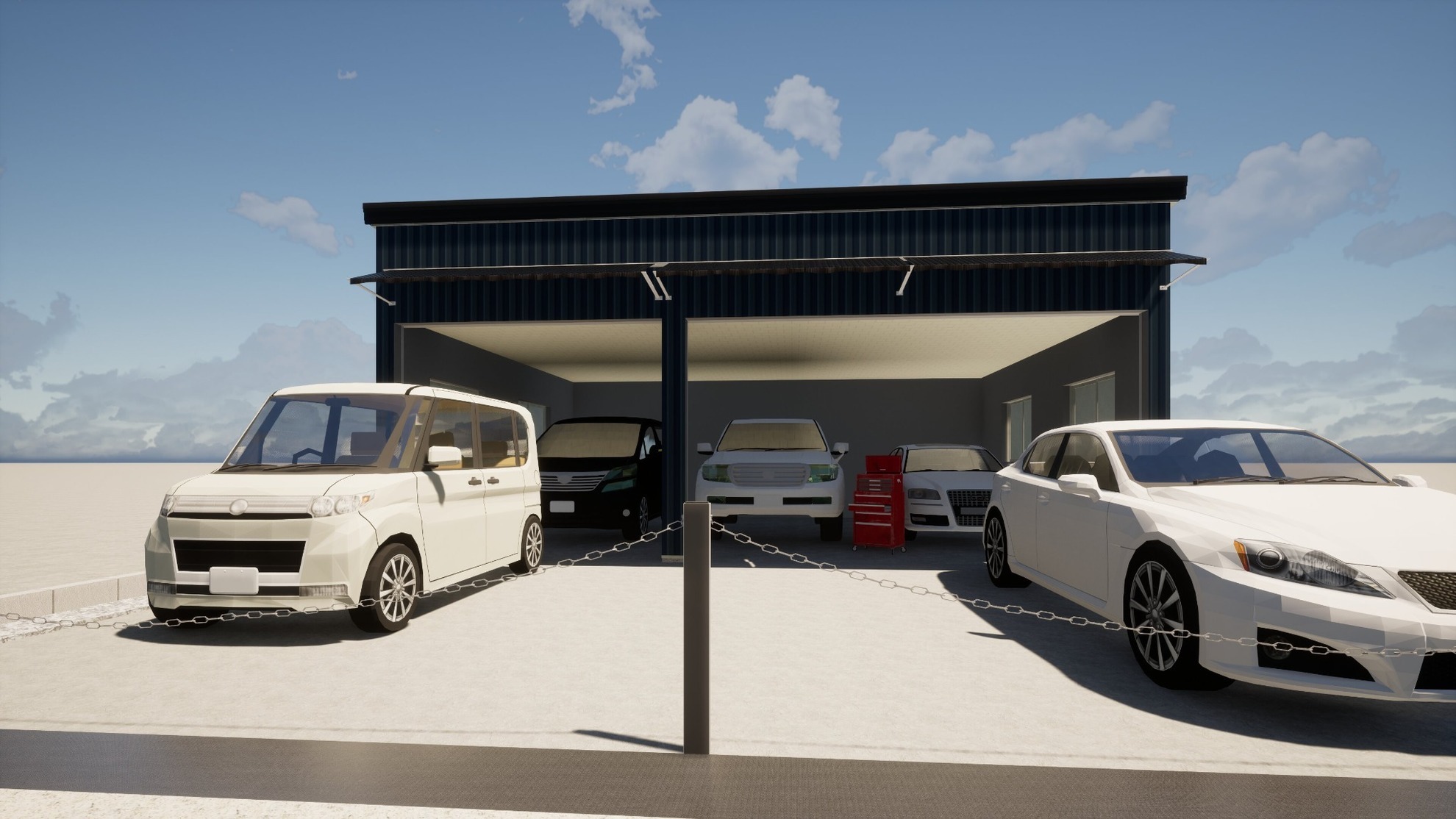 幹線道路沿いに立地するスマホショップを、写真リアルで表現した外観CGです。