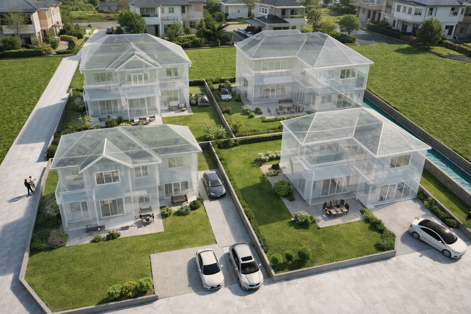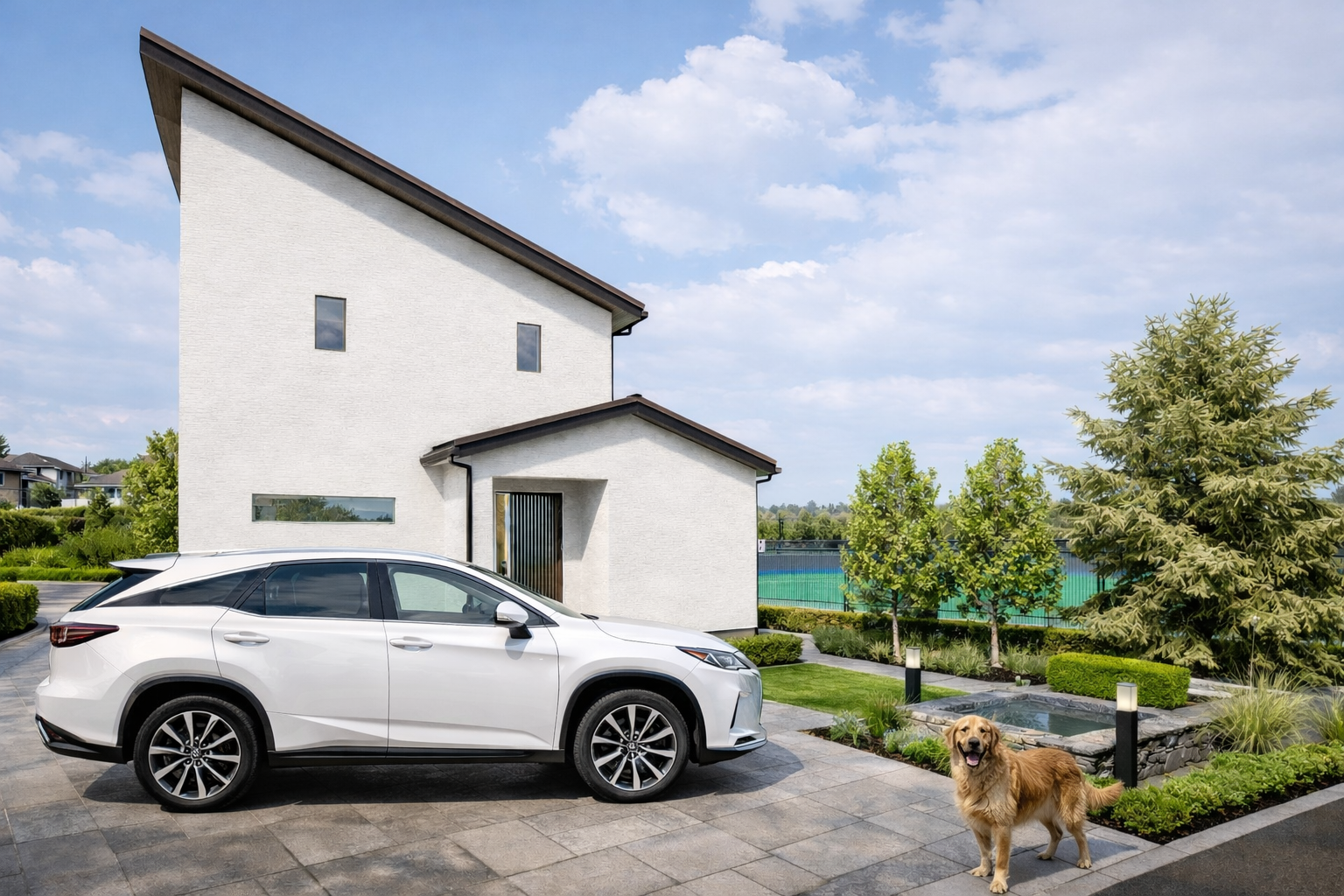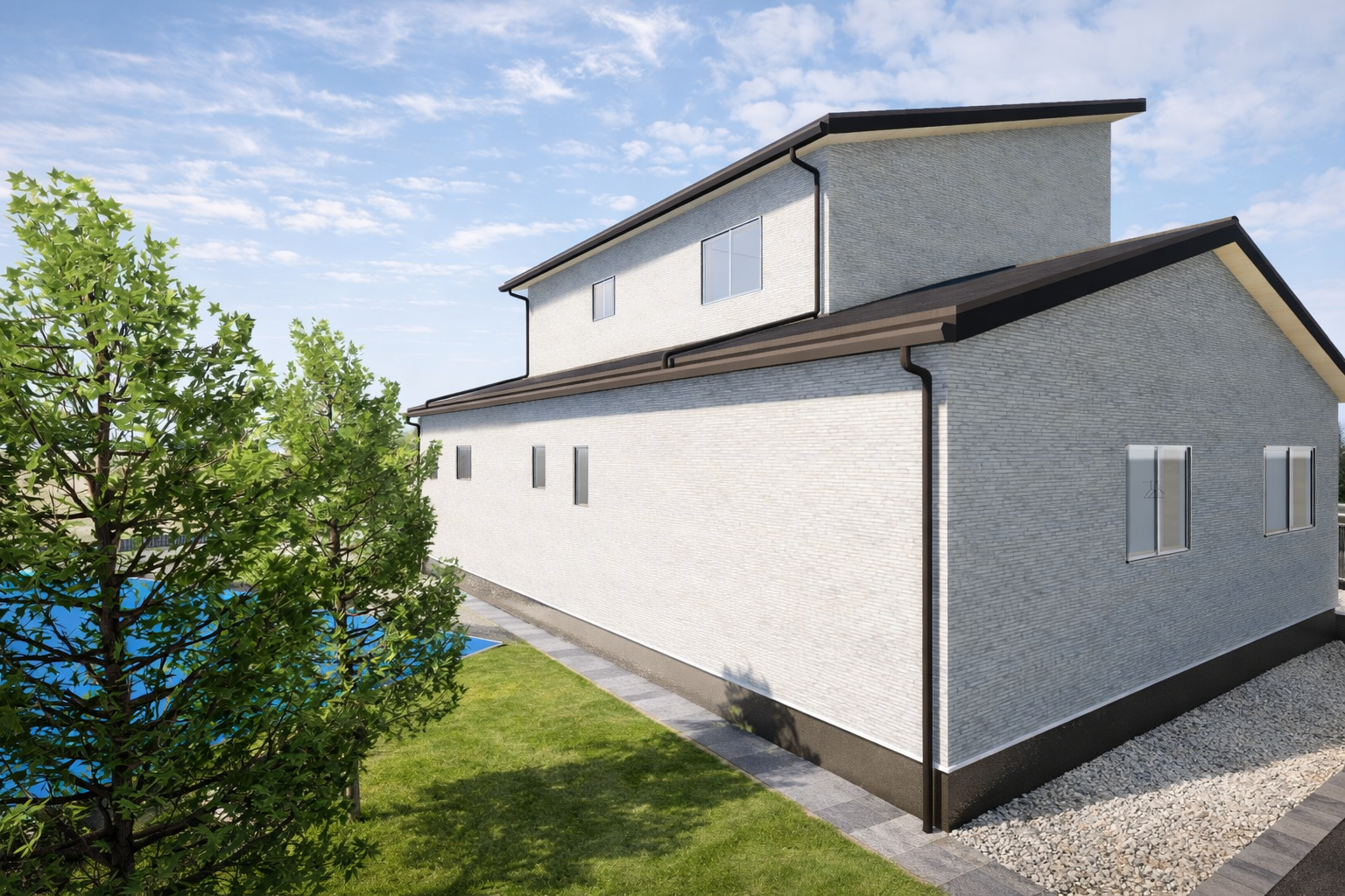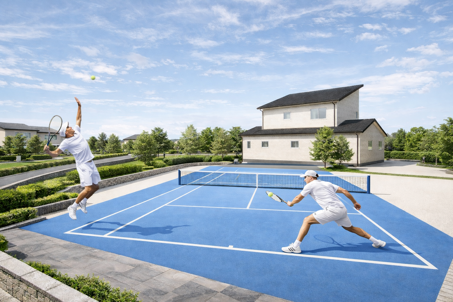 建物の美しいライン、上質な外構、開放感ある庭、そしてプライベート感あふれるテニスコートまで、理想の住環境を高精細に可視化しました。