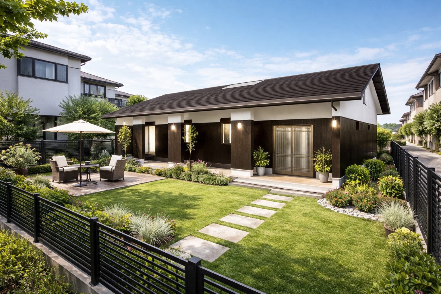 道路側からの見え方はすっきりと上品に整えながら、建物内部では採光・通風・プライバシーにしっかり配慮。