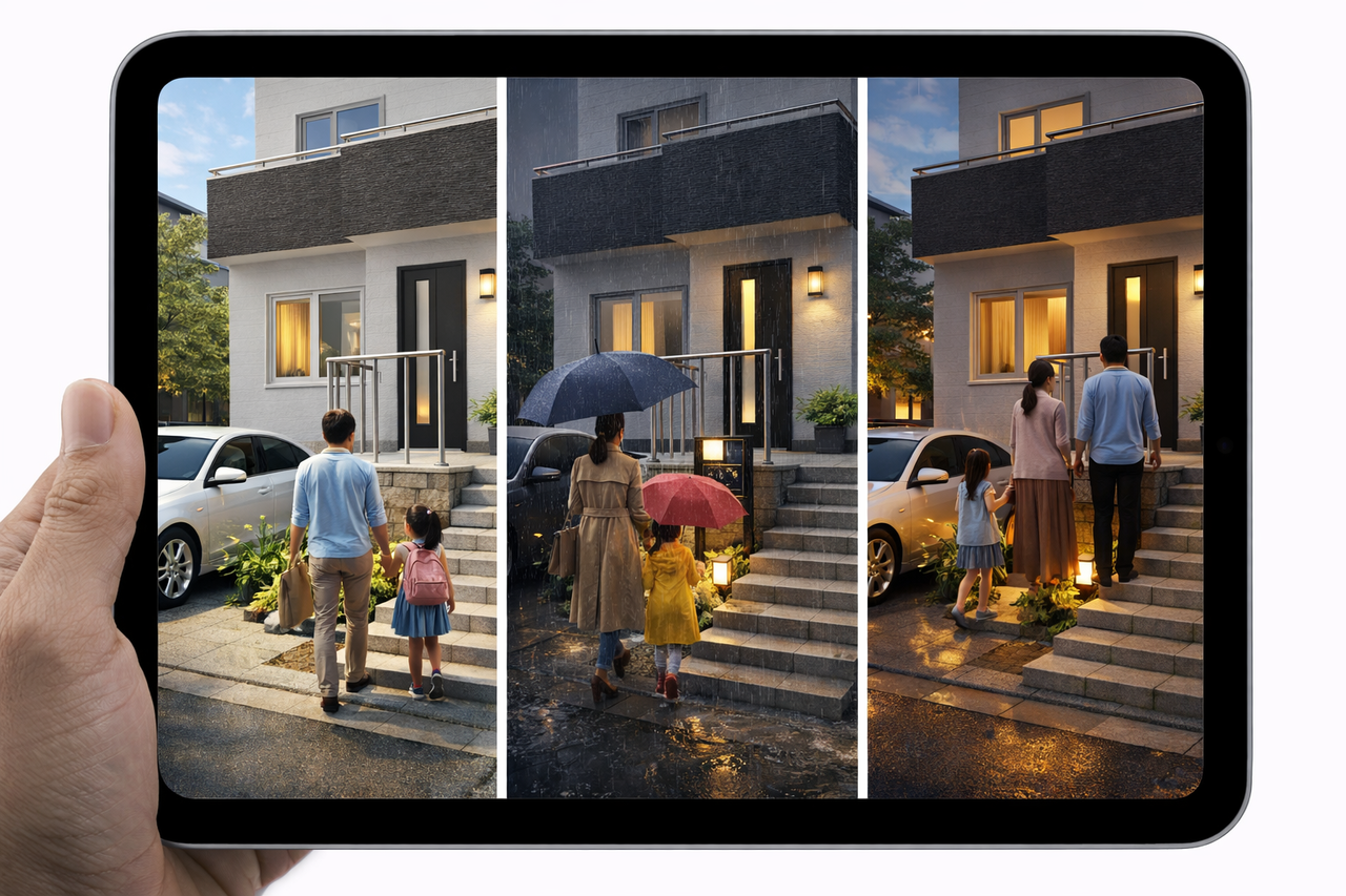 当社で作成したベースプランをもとに、AIがリアルな外観・内観・外構表現へ。